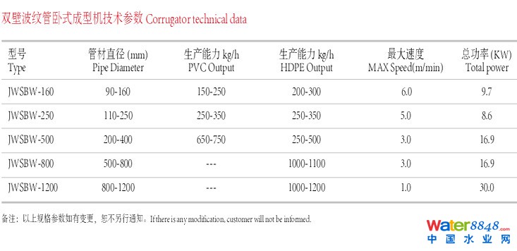 性能和優(yōu)點:HDPE/PP/PVC 雙壁波紋管應(yīng)用廣泛。本公司自主研發(fā)的HDPE 雙壁波紋管生產(chǎn)線,擁有多項專利技術(shù)。自動化程度高,運行穩(wěn)定,產(chǎn)量高。HDPE/PP 采用新型高效單螺桿擠出機,PVC 采用大型平雙或錐雙擠出機,擠出量大。成形機采用臥式結(jié)構(gòu),梭式傳動,密封水冷結(jié)構(gòu),真空成型,可實現(xiàn)在線雙層擴口。整線采用電腦人機界面控制,具有很高的自控性。