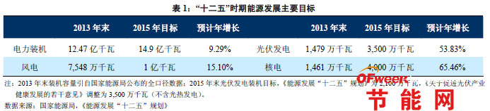 根據(jù)能源發(fā)展“十二五”規(guī)劃,到2015年我國電力裝機(jī)容量將達(dá)到14.9億千瓦,其中,風(fēng)電、太陽能和核電的裝機(jī)容量分別達(dá)到10,000萬千瓦、3500萬千瓦和4000萬千瓦。