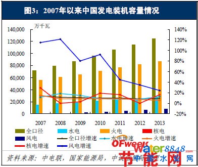 風(fēng)電是近年來發(fā)展最快的新能,風(fēng)電所發(fā)電量占所有電源發(fā)電量的比重自2008年的低于0.5%逐年增長至2012年的2.00%左右,2013年進(jìn)一步增長至2.5%以上。