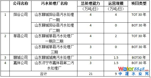 據了解,此次收購的4家污水處理公司包括陽谷公司、莘縣公司、聊城公司及嘉祥公司。該4家污水處理公司擁有污水處理廠的特許經營權,污水處理總規(guī)模為21萬噸/日,其中運營項目9萬噸/日,在建項目5萬噸/日,籌建項目7萬噸/日。預計在建項目將于2014年投運。
