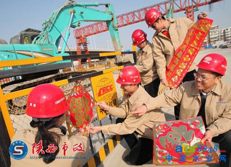 中鐵十八局集團(tuán)五公司天津地鐵五號(hào)線項(xiàng)目經(jīng)理譚偉姿(右一)、書(shū)記鄭衛(wèi)紅(左一)帶領(lǐng)大家在工地貼春聯(lián)、福字