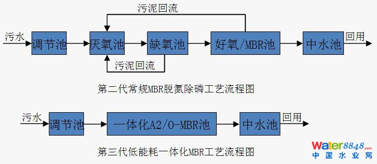 一種新型低能耗一體化A2/O-MBR反應(yīng)器(專利號(hào):201510092932.8與變量曝氣技術(shù)(201410385247X)兩項(xiàng)專利結(jié)合,可將曝氣量降至第二代常規(guī)MBR的25-30%左右,與傳統(tǒng)活性污泥法的曝氣能耗相當(dāng);