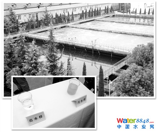 左圖 陜西一家污水處理廠向參觀者展示污水處理前和處理后的樣子。