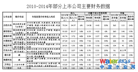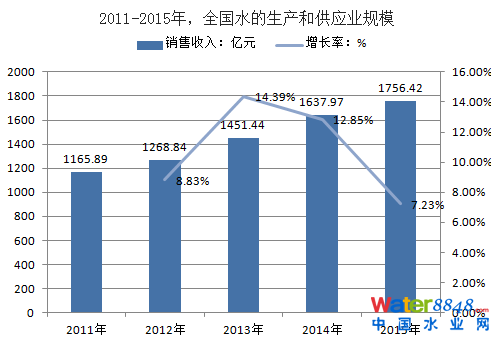 相關(guān)報(bào)告顯示:截至2014年底,我國規(guī)模以上水的生產(chǎn)和供應(yīng)業(yè)企業(yè)數(shù)量總計(jì)1346家,截至2015年,全國水的生產(chǎn)和供應(yīng)業(yè)規(guī)模以上企業(yè)數(shù)量達(dá)1491家。2015年,我國水務(wù)行業(yè)規(guī)模以上企業(yè)資產(chǎn)總額達(dá)9807.78億元;水的生產(chǎn)和供應(yīng)業(yè)企業(yè)銷售收入1756.42億元,同比增長了7.23%;銷售毛利率為25.04%;成本費(fèi)用利潤率為6.11%;銷售利潤率為5.94%;總資產(chǎn)利潤率為1.06%;自來水的生產(chǎn)和供應(yīng)行業(yè)共計(jì)實(shí)現(xiàn)銷售收入為1323.39億元,同比增長8.26%。