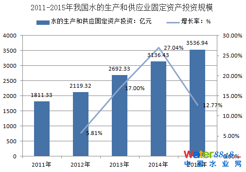 2014年,我國水的生產(chǎn)和供應(yīng)業(yè)固定資產(chǎn)投資(不含農(nóng)戶)達(dá)到3136.43億元,同比增長16.49%;2015年我國水的生產(chǎn)和供應(yīng)業(yè)固定資產(chǎn)投資(不含農(nóng)戶)達(dá)到3536.94億元。