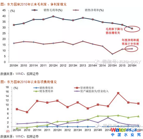 2016年上半年,東方園林綜合毛利率為29%,比上年同期下降4.7個(gè)百分點(diǎn),但這一毛利率下降與2016年開(kāi)始執(zhí)行的“營(yíng)改增”有關(guān),并非公司項(xiàng)目盈利能力下降所至。營(yíng)改增自2016年5月開(kāi)始執(zhí)行,而5、6月正逢公司收入確認(rèn)高峰,因此對(duì)公司上半年收入仍有較大影響,導(dǎo)致毛利率下滑。