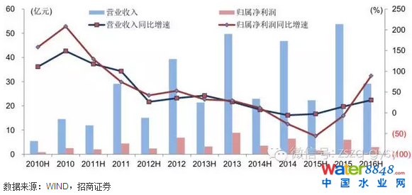 圖:2010年以來(lái)東方園林中報(bào)、年報(bào)收入及凈利潤(rùn)增長(zhǎng)情況