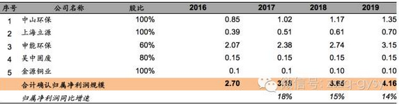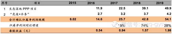 此外,公司2015年大舉并購(gòu),進(jìn)軍危廢和鄉(xiāng)鎮(zhèn)水務(wù)等環(huán)保行業(yè)其他領(lǐng)域,2016-2017年,按照并購(gòu)公司利潤(rùn)承諾給予計(jì)算,2018年-2019年,則根據(jù)危廢處理能力提升的預(yù)期進(jìn)度,鄉(xiāng)鎮(zhèn)水務(wù)市場(chǎng)的增長(zhǎng)速度進(jìn)行估算,得出危廢、水務(wù)貢獻(xiàn)收入利潤(rùn)情況。