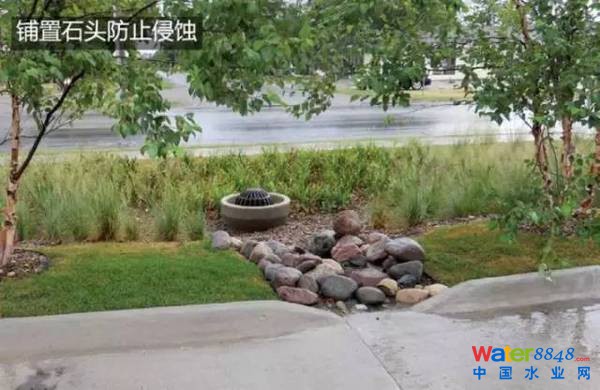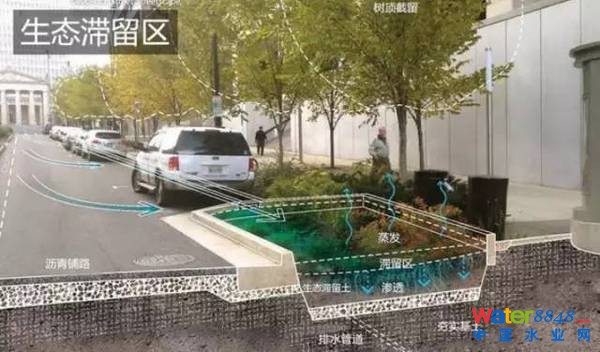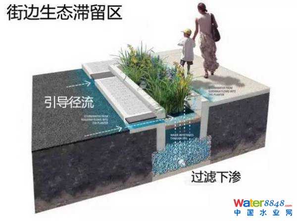 ?和雨水花園具有相同功能的措施還有生態(tài)滯留區(qū)。但較前者不同的是,生態(tài)滯留區(qū)土壤對(duì)于工程技術(shù)要求相當(dāng)嚴(yán)格,對(duì)于土壤和工程排水結(jié)構(gòu)也都有明確的要求,并且根據(jù)位置的不同可分為生態(tài)滯留帶、生態(tài)樹(shù)池、生態(tài)滯留池等。如同下圖街邊生態(tài)滯留區(qū),通過(guò)對(duì)街豁口將路面徑流引流至收水區(qū)進(jìn)行蓄留。
