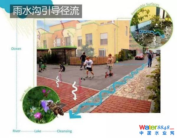?除了設(shè)于綠地的雨水管理措施,在硬質(zhì)地面可以通過(guò)透水鋪裝實(shí)現(xiàn)雨水滲透,或通過(guò)水渠和溝槽將雨水引流至街道附近的滯留設(shè)施中,凈化的雨水可以就地消化于水景觀(guān)中,打造互動(dòng)的親水景觀(guān)。