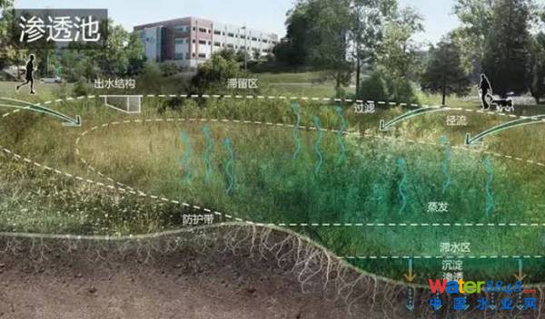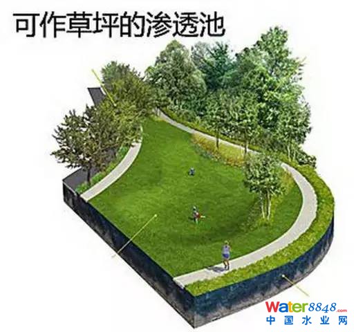 ?如果說(shuō)以上的幾個(gè)措施都更適用于綠化空間較小的區(qū)域,那么滲透池則適用于綠地面積較大的開(kāi)闊空間,滲水池能有效地削減徑流峰值,補(bǔ)充地下水。同時(shí)可以設(shè)計(jì)為草坪綠地,在天氣晴朗的時(shí)候供居民放松。
