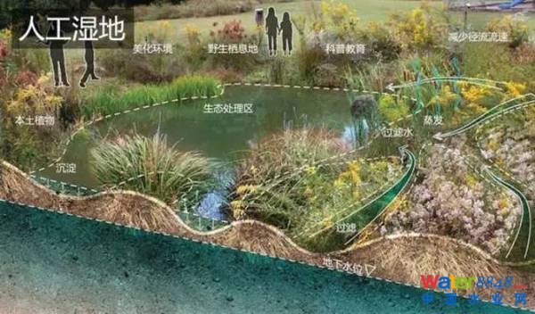 ?近但功能不同的人工濕地是對(duì)雨水調(diào)蓄與凈化的措施。其可以將雨水花園、植草溝等措施收集的雨水進(jìn)行集中凈化,與其他處理手法一起形成多功能的雨水調(diào)蓄系統(tǒng),打造怡人的濕地景觀(guān)。