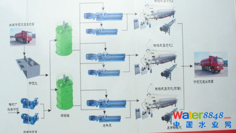 無錫錫山污水處理廠成立于2002年,日處理污水7萬t/d,污泥含水率97%——98%左右。2010年12月,約1000m3/d的錫山污泥脫水處置項目開工建設(shè),并預(yù)留了遠期處理能力。 錫山污泥處置項目直接調(diào)質(zhì)深度脫水,現(xiàn)場布置了3臺泥水一體化板框壓濾機,處理后含水率由98%降至60%以下,污泥減量達60%。其中 “泥漿螺旋分配器”、“凸起粒子濾板”、“錐形濾布”等設(shè)備均由無錫國聯(lián)自主研發(fā)。板框壓濾脫水時采用間隔的“遞增式”施壓脫水工藝,經(jīng)過壓濾機處理的濕污泥變成了一塊塊的污泥干餅,含水率得到大幅降低。
