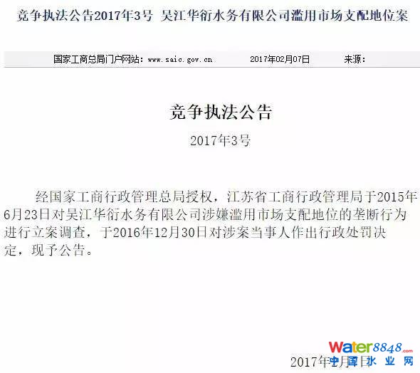 2月7日,國(guó)家工商總局公布了江蘇省工商行政管理局對(duì)吳江華衍水務(wù)有限公司濫用市場(chǎng)支配地位案的處罰決定書(shū)。