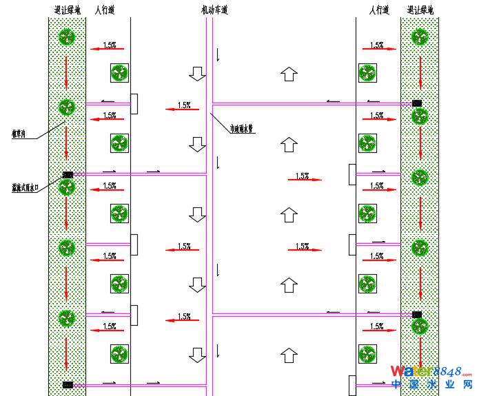 ②當(dāng)?shù)缆房v坡<2 %時(shí),宜采用分散式海綿設(shè)施,沿道路縱坡布置,利用道路綠化帶和兩邊退讓綠地設(shè)置各類海綿設(shè)施。