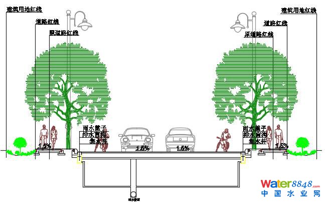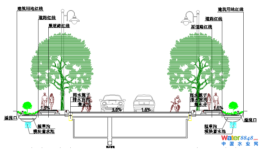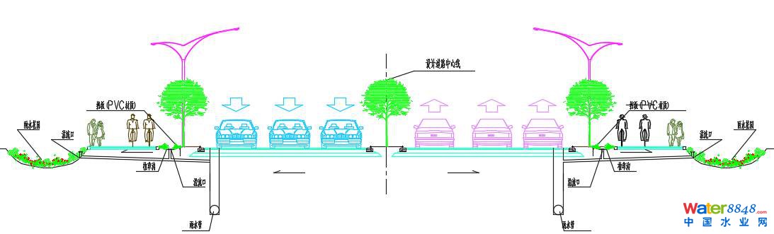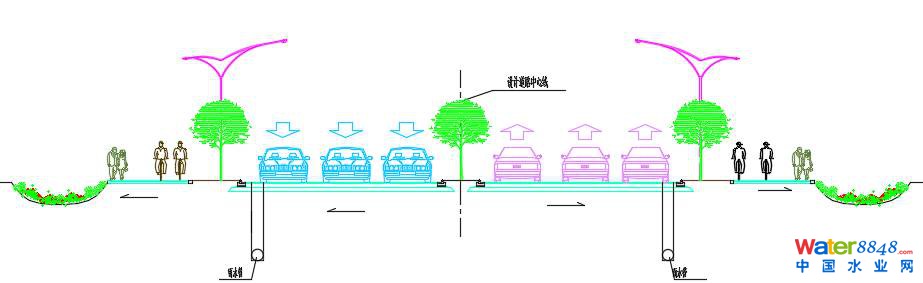 ⑥海綿設(shè)施設(shè)計(jì)時(shí)應(yīng)設(shè)計(jì)必要的防滲措施,防止徑流雨水下滲對(duì)道路路面及路基的強(qiáng)度和穩(wěn)定性造成破壞。