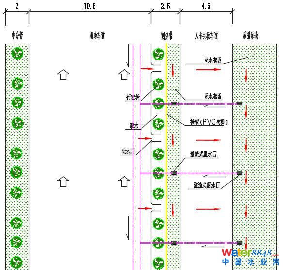 ③徑流總量控制或雨水資源利用指標(biāo)要求較高且地下空間允許時(shí),可在中分帶下設(shè)置雨水儲(chǔ)存設(shè)施(如蓄水模塊)。