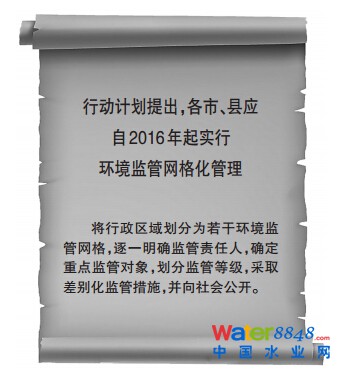 一是劃分監(jiān)管網(wǎng)格。針對(duì)違法排污屢禁不止、部分區(qū)域排污不降反增、部分小溝小汊污染加重等問題,必須進(jìn)一步加強(qiáng)環(huán)境監(jiān)管。《水十條》提出,各市、縣應(yīng)自2016年起實(shí)行環(huán)境監(jiān)管網(wǎng)格化管理,即將行政區(qū)域劃分為若干環(huán)境監(jiān)管網(wǎng)格,逐一明確監(jiān)管責(zé)任人,確定重點(diǎn)監(jiān)管對(duì)象,劃分監(jiān)管等級(jí),采取差別化監(jiān)管措施,并向社會(huì)公開。
