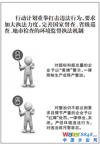 《水十條》重拳打擊違法行為,要求加大執(zhí)法力度,完善國家督查、省級(jí)巡查、地市檢查的環(huán)境監(jiān)督執(zhí)法機(jī)制。實(shí)行“紅黃牌”管理,對(duì)超標(biāo)和超總量的企業(yè)予以“黃牌”警示,一律限制生產(chǎn)或停產(chǎn)整治;對(duì)整治仍不能達(dá)到要求且情節(jié)嚴(yán)重的企業(yè)予以“紅牌”處罰,一律停業(yè)、關(guān)閉。嚴(yán)懲環(huán)境違法行為,對(duì)違法排污零容忍。