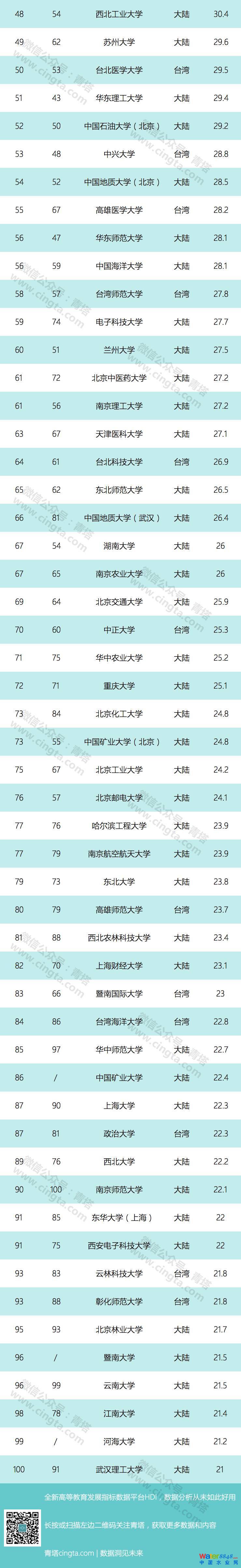百強(qiáng)中,有不少排名上升速度較快的高校。與上次排名結(jié)果相比,大陸高校中,天津大學(xué)、蘇州大學(xué)、電子科技大學(xué)、北京中醫(yī)藥大學(xué)、中國地質(zhì)大學(xué)(武漢)、北京化工大學(xué)、華中師范大學(xué)、中國礦業(yè)大學(xué)、南京師范大學(xué)、暨南大學(xué)均有超過10個(gè)位次的排名提升,展示了內(nèi)地高校強(qiáng)勁的發(fā)展勢頭。其中,中國礦業(yè)大學(xué)首次入榜百強(qiáng)高校,今年排在86位。