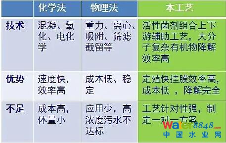 以上5項(xiàng)技術(shù)的應(yīng)用,使得物化預(yù)處理+微生物強(qiáng)化處理工藝與傳統(tǒng)處理技術(shù)相比較,在運(yùn)行成本、處理效率、管理難度等方面均有所改善,優(yōu)劣對比如下表所示。