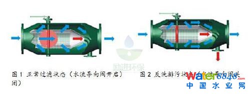 當(dāng)過(guò)濾器工作時(shí)(如圖1所示),水流導(dǎo)向閥處于開(kāi)啟狀態(tài),水流由入口口進(jìn)入過(guò)濾器,經(jīng)過(guò)漶網(wǎng)過(guò)濾后流入出ロ。本機(jī)采用壓差控制、定位控制自自動(dòng)清洗濾網(wǎng)。當(dāng)過(guò)濾器進(jìn)出口差壓達(dá)設(shè)定值或定時(shí)器達(dá)到預(yù)置時(shí)間時(shí),電動(dòng)控制箱發(fā)出信號(hào),排污閥打開(kāi),水流導(dǎo)向閥處于開(kāi)啟狀態(tài)(如圖2所示)),水流沖洗粘在濾網(wǎng)內(nèi)壁上的雜質(zhì)被進(jìn)一步?jīng)_洗排出,當(dāng)水流導(dǎo)向閥處于全關(guān)狀態(tài)下,水流被迫從過(guò)濾器進(jìn)口段網(wǎng)孔進(jìn)入濾網(wǎng)外側(cè),大部分凈液從出口流出,部分凈液又從濾網(wǎng)外側(cè)進(jìn)入漶網(wǎng)內(nèi)部(因?yàn)橄到y(tǒng)會(huì)處于泄壓狀態(tài),濾網(wǎng)內(nèi)部壓力小于外側(cè)壓力),從而對(duì)濾網(wǎng)進(jìn)行反沖洗,特殊結(jié)構(gòu)的不銹鋼契形濾網(wǎng)使得在漶網(wǎng)內(nèi)部產(chǎn)生了噴射效果,任何雜志都被從光滑的內(nèi)壁上沖走。當(dāng)過(guò)濾器進(jìn)出口壓差恢復(fù)正;蚨〞r(shí)器設(shè)定時(shí)間結(jié)束后,電動(dòng)排污閥關(guān)閉,水流導(dǎo)向閥開(kāi)啟。整個(gè)沖洗過(guò)程系統(tǒng)可正常工作,無(wú)需停機(jī)。