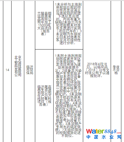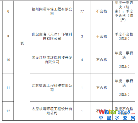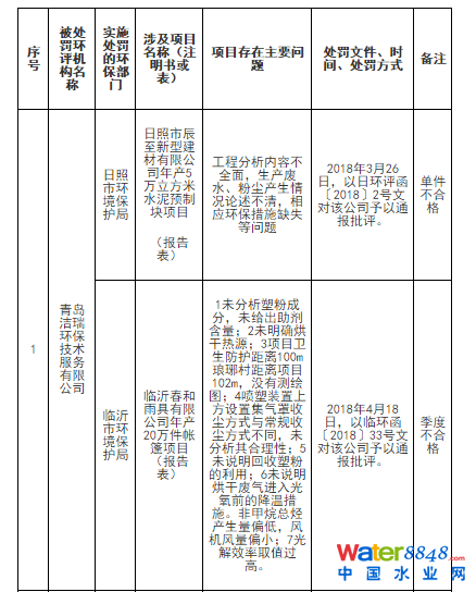 在環(huán)評(píng)機(jī)構(gòu)處理情況方面上,福州閩涵環(huán)保工程有限公司等6家環(huán)評(píng)機(jī)構(gòu)編制的環(huán)評(píng)文件因存在《通知》第七條重大原則性問(wèn)題,直接判定其環(huán)評(píng)機(jī)構(gòu)環(huán)評(píng)文件年度質(zhì)量為不合格,已由環(huán)評(píng)文件審批環(huán)保部門(mén)責(zé)令環(huán)評(píng)機(jī)構(gòu)、編制主持人、主要編制人員限期整改六至十二個(gè)月。青島潔瑞環(huán)保技術(shù)服務(wù)有限公司等40家環(huán)評(píng)機(jī)構(gòu)因編制的環(huán)評(píng)文件質(zhì)量較差,單件文件質(zhì)量考核不合格,已由環(huán)評(píng)文件審批環(huán)保部門(mén)責(zé)令環(huán)評(píng)機(jī)構(gòu)、編制主持人、主要編制人員限期整改六個(gè)月或通報(bào)批評(píng)。