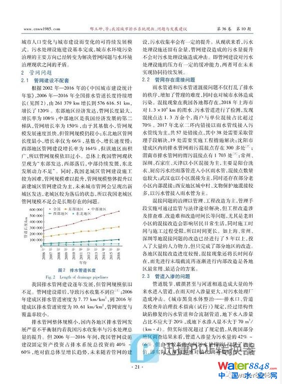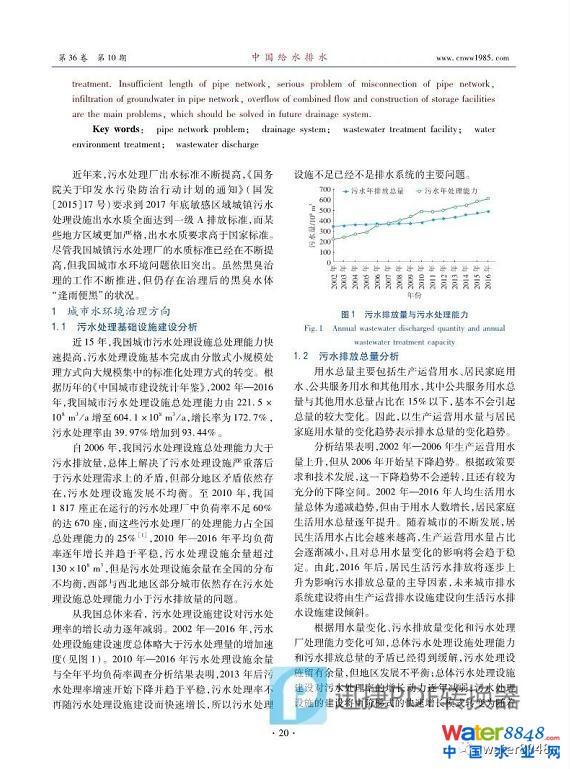 隨著城市化、工業(yè)化速度的加快,我國城市污水排放量逐年增長,污水處理設(shè)施規(guī)模逐年增大,但城市水環(huán)境治理依然存在問題。通過分析2002年—2016年我國城市污水處理設(shè)施的發(fā)展與現(xiàn)狀,發(fā)現(xiàn)我國污水處理設(shè)施的基礎(chǔ)建設(shè)已經(jīng)基本完成,污水排放量與末端處理設(shè)施能力的矛盾已得到緩解且污水處理設(shè)施留有余量,污水處理設(shè)施的建設(shè)由階梯式的快速增長模式轉(zhuǎn)變?yōu)殡S著城市人口變化與城市建設(shè)而變化的可持續(xù)發(fā)展模式。而城市水環(huán)境污染治理的主要方向已經(jīng)轉(zhuǎn)變?yōu)榻鉀Q管網(wǎng)問題與水環(huán)境治理現(xiàn)狀之間的矛盾,管網(wǎng)規(guī)模不足、混接問題嚴重、地下水入滲、合流制溢流、調(diào)蓄建設(shè)不足是未來排水系統(tǒng)應該解決的主要問題。
