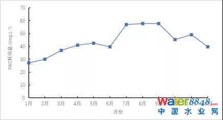 PAC的主要作用是降低濁度,但是為了控制出廠水中總鋁的含量, PAC還承擔(dān)著調(diào)節(jié)原水pH值的作用,特別是在夏季藻類爆發(fā)導(dǎo)致原水pH值升高時,為了確保出水鋁達(dá)標(biāo),要將PAC加酸使藥劑pH值調(diào)至3.0左右,因此PAC的投加量較大。如圖10所示,惠南水廠2019年夏季7月、8月和9月的PAC平均投量分別為56.9、57.8、57.8 mg/L,而冬季12月、1月、2月的PAC平均投量分別為39.6、27.2、30.1 mg/L,在原水中藻類爆發(fā)的夏季PAC用量遠(yuǎn)高于冬季。