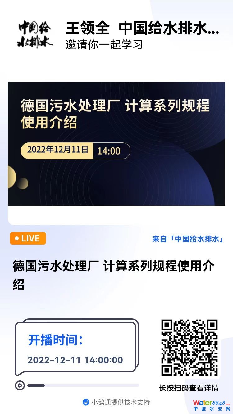 中國水協(xié)團體標(biāo)準(zhǔn)《城市供水企業(yè)突發(fā)事件應(yīng)急預(yù)案編制技術(shù)規(guī)程》宣貫會通知 中國城鎮(zhèn)供水排水協(xié)會 直播:中國水協(xié)城鎮(zhèn)供水排水協(xié)會城鎮(zhèn)水環(huán)境專業(yè)委員會2024年年會 直播時間:2024年11月1日(周五) 08:30—18:00 2024-11-01 08:30:00 開始