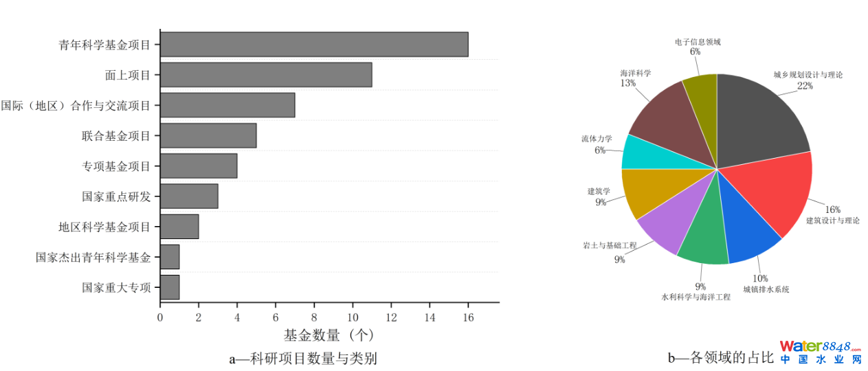 相較于歐美的數(shù)字水務(wù)注重理論和基礎(chǔ)方法創(chuàng)新,我國智慧水務(wù)科研注重技術(shù)應(yīng)用和解決實(shí)際水務(wù)問題,例如水質(zhì)監(jiān)測和污染控制,主要以政府機(jī)構(gòu)、科研院所、大學(xué)和企業(yè)等多方合作的方式?蒲谐晒矫,如圖6所示,圍繞“智慧+水務(wù)”作為關(guān)鍵詞的國家級課題共計(jì)95個(gè),其中與城市相關(guān)的主題資助率較高。但資助領(lǐng)域交叉性強(qiáng),與水務(wù)直接相關(guān)性小,水務(wù)科研人員參與度有待提高。華北院自主研發(fā)的一體機(jī)大腦Simuwater,是國內(nèi)首款集機(jī)理模型、概化模型及人工智能于一體的混合模型,實(shí)現(xiàn)了無縫耦合流域城市排水系統(tǒng)仿真,打破了排水系統(tǒng)仿真受限于國外的瓶頸。而哈爾濱工業(yè)大學(xué)主導(dǎo)開發(fā)的基于AI的碳排核算模型(馬頭崗污水廠項(xiàng)目),結(jié)合機(jī)理模型與數(shù)據(jù)驅(qū)動(dòng)算法,建立了生物處理過程“碳代謝”模型,發(fā)展了水處理碳排放實(shí)時(shí)計(jì)量方法,實(shí)現(xiàn)了碳排放的分鐘級別計(jì)量。博愛第二污水廠項(xiàng)目應(yīng)用數(shù)字孿生賦能污水廠低碳運(yùn)維,采用三維可視化建模,工藝仿真、自控仿真和三維可視化等技術(shù)構(gòu)建了三維虛擬水廠,整合了設(shè)備的靜態(tài)數(shù)據(jù)和運(yùn)行動(dòng)態(tài)數(shù)據(jù),實(shí)時(shí)反映現(xiàn)場細(xì)節(jié),實(shí)現(xiàn)水質(zhì)預(yù)測、水量預(yù)測、生化分析、物料平衡、運(yùn)行調(diào)整、設(shè)備維護(hù)、故障診斷等功能。