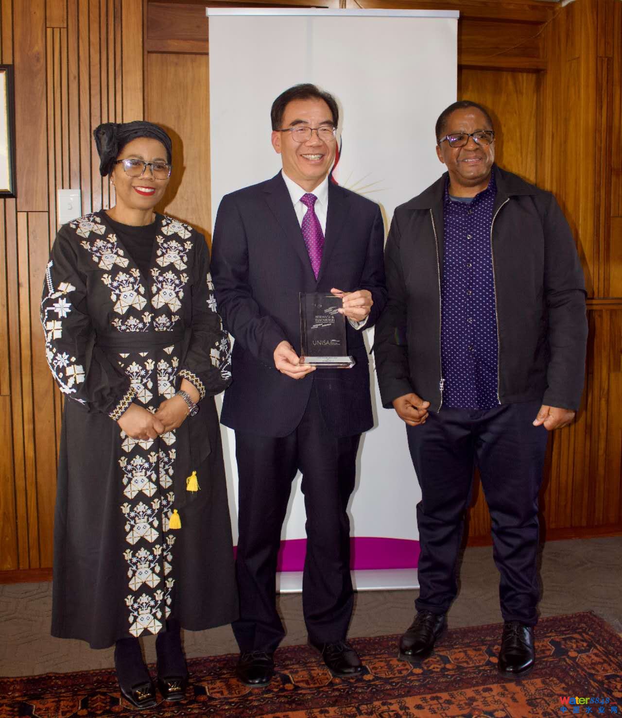 南非大學(xué)普倫·倫卡布拉教授和南非大學(xué)工程與技術(shù)學(xué)院院長(zhǎng)貝基·曼巴教授為李建新客座教授頒發(fā)2024年度南非國(guó)家自然基金委國(guó)際學(xué)者認(rèn)證和年度研究與創(chuàng)新獎(jiǎng)合影(20246月)