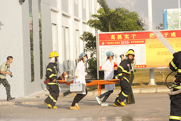 下午16:00點整,一聲急促的警報拉開了此次演練活動的帷幕。“火情”從辦公大樓三層某辦公室起火,火勢燃燒猛烈并迅速向四周蔓延,情況危急。中國電子北海產(chǎn)業(yè)園立即啟動《滅火應(yīng)急疏散預(yù)案》,滅火救援行動組、現(xiàn)場警戒組、技術(shù)保障組、疏散引導(dǎo)組、通訊聯(lián)絡(luò)組、醫(yī)療救護組立即投入各自崗位,組織疏散樓內(nèi)人員,利用室內(nèi)消火栓進行滅火,并隨即撥打119報警。員工紛紛拿起了自備的濕毛巾,捂著口鼻,沿著廠房疏散通道迅速有序的離開“火災(zāi)現(xiàn)場”到達安全地帶。5分鐘后,北海市消防支隊特勤中隊消防官兵到達現(xiàn)場,經(jīng)偵查,發(fā)現(xiàn)火勢起火點在三樓的展廳并且燃燒猛烈,大量煙霧竄至樓外,有人員被困樓頂。指揮員立即匯報并下達搜救命令。搜救小組由大樓正門進入,從三樓至一樓進行搜救,利用擔(dān)架將受傷員工轉(zhuǎn)移到救護車上。救援小組利用云梯車將被困樓頂?shù)膯T工成功營救到地面。在消防隊員的強攻下,火勢及時得到控制。整個演練過程指揮得當(dāng)、操作規(guī)范、緊張有序。