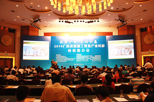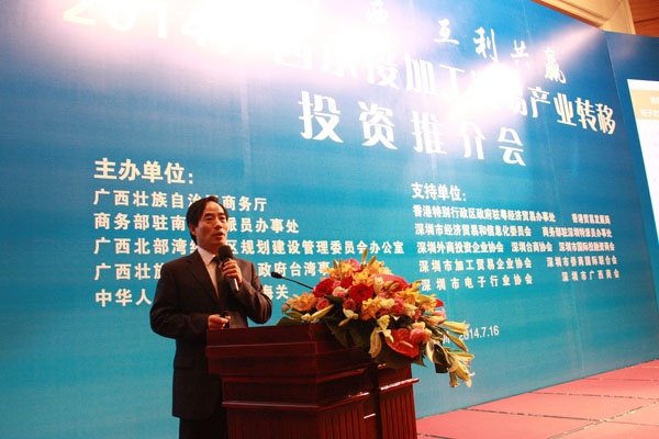 2014年7月16日,由自治區(qū)商務(wù)廳主辦的2014廣西承接加工貿(mào)易產(chǎn)業(yè)轉(zhuǎn)移投資推介會(huì)在深圳舉行。自治區(qū)政府副秘書(shū)長(zhǎng)魏然,深圳市經(jīng)濟(jì)貿(mào)易和信息化委員會(huì)副主任高林等領(lǐng)導(dǎo)和嘉賓為會(huì)議致辭。自治區(qū)商務(wù)廳、北部灣辦分別從不同角度對(duì)廣西承接加工貿(mào)易產(chǎn)業(yè)轉(zhuǎn)移投資環(huán)境進(jìn)行了推介。北海、欽州、梧州、南寧四個(gè)國(guó)家級(jí)加工貿(mào)易梯度轉(zhuǎn)移重點(diǎn)承接地,欽州保稅港區(qū)、憑祥綜合保稅區(qū)、北海出口加工區(qū)、中馬欽州產(chǎn)業(yè)園、東興國(guó)家重點(diǎn)開(kāi)發(fā)開(kāi)放試驗(yàn)區(qū)、南寧高新技術(shù)產(chǎn)業(yè)開(kāi)發(fā)區(qū)、中國(guó)電子北海產(chǎn)業(yè)園、梧州市粵桂合作特別實(shí)驗(yàn)區(qū)八個(gè)重點(diǎn)園區(qū),分別就各自的產(chǎn)業(yè)布局、投資環(huán)境、政策優(yōu)勢(shì)進(jìn)行了推介。香港特區(qū)政府駐粵辦、香港貿(mào)易發(fā)展局、深圳外商投資企業(yè)協(xié)會(huì)、深圳臺(tái)商協(xié)會(huì)、深圳市加工貿(mào)易企業(yè)協(xié)會(huì)、深圳市企業(yè)聯(lián)合會(huì)、深圳市電子行業(yè)協(xié)會(huì)及廣東各類(lèi)加工貿(mào)易企業(yè)約400人出席了推介會(huì)。