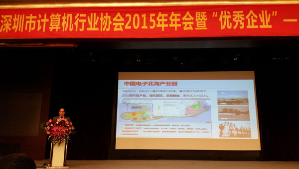 2016年1月7日,深圳市計算機行業(yè)協(xié)會2015年年會隆重舉行,受協(xié)會之邀,中國電子科技開發(fā)有限公司總經(jīng)理、北海市電子信息行業(yè)協(xié)會會長賀海華率中電科技旗下北海、西安、溫州園區(qū)參加盛會,賀海華與會員單位分享交流了中電科技建設產(chǎn)業(yè)園區(qū)板塊經(jīng)驗,介紹推介了各地方園區(qū)產(chǎn)業(yè)特點,衷心希望與各會員企業(yè)開展產(chǎn)業(yè)合作,歡迎來園區(qū)調研、拓展業(yè)務,賀海華的精彩講解得到了參會嘉賓們的高度認同與熱烈回應。盛會間隙,北海、溫州、西安園區(qū)相關負責人和意向投資企業(yè)進行了暢談,現(xiàn)場氣氛活躍,很多企業(yè)對中國電子投資建園的地區(qū)表達了合作意向,愿意進一步加強了解與合作,其中,北海以獨特的區(qū)位優(yōu)勢、產(chǎn)業(yè)政策、生態(tài)優(yōu)勢,備受多家深圳企業(yè)重點關注。