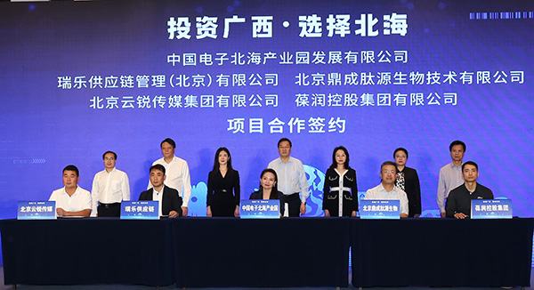 在北海市委書記蔡錦軍,市委常委、常務(wù)副市長(zhǎng)譚秀洪,市委常委、秘書長(zhǎng)鄭定雄,經(jīng)開(kāi)區(qū)管委會(huì)主任劉忠廣,中國(guó)電子北海產(chǎn)業(yè)園公司執(zhí)行董事徐俊男,長(zhǎng)江商學(xué)院老師徐汀、長(zhǎng)江商學(xué)院老師許耀公的見(jiàn)證下,中國(guó)電子北海產(chǎn)業(yè)園發(fā)展有限公司與北京云銳傳媒集團(tuán)有限公司、北京鼎成肽源生物技術(shù)有限公司、瑞樂(lè)供應(yīng)鏈管理(北京)有限公司、葆潤(rùn)控股集團(tuán)有限公司簽署合作協(xié)議。