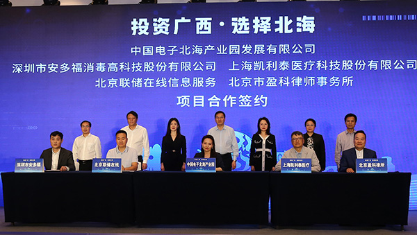 在北海市委書記蔡錦軍,市委常委、常務(wù)副市長(zhǎng)譚秀洪,市委常委、秘書長(zhǎng)鄭定雄,經(jīng)開(kāi)區(qū)管委會(huì)主任劉忠廣,中國(guó)電子北海產(chǎn)業(yè)園公司執(zhí)行董事徐俊男,長(zhǎng)江商學(xué)院老師徐汀、長(zhǎng)江商學(xué)院老師許耀公的見(jiàn)證下,中國(guó)電子北海產(chǎn)業(yè)園發(fā)展有限公司與上海凱利泰醫(yī)療科技股份有限公司、北京聯(lián)儲(chǔ)在線信息服務(wù)有限公司、深圳市安多福消毒高科技股份有限公司、北京市盈科律師事務(wù)所簽署合作協(xié)議。